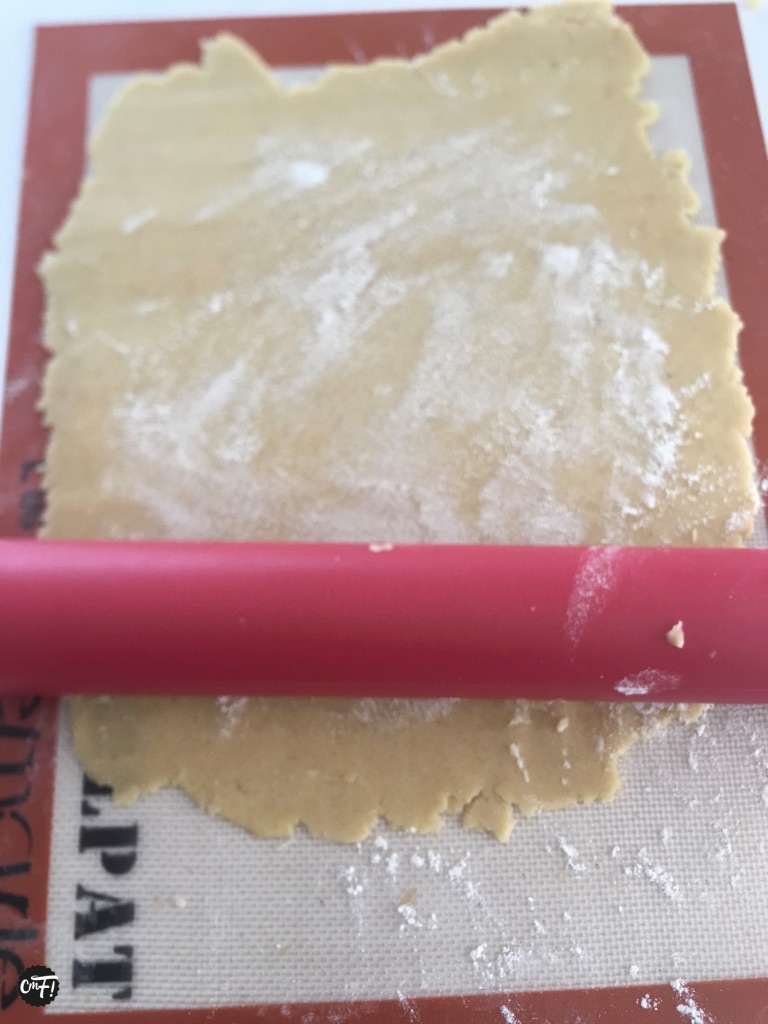 Divisez la pâte en deux (inutile de tout étaler car il y a de quoi faire deux tartes) et étalez la pâte sur une Silpat. On ne peut pas étaler sur une Silpain à cause des trous dans lesquels s’insère la pâte. Il faut une Silpat car sa surface est lisse. Farinez légèrement la pâte car elle colle à cause du beurre. Il faut l’abaisser sur 4mm. Pour cela j’utilise un rouleau avec des anneaux qui permettent d’obtenir une parfaite régularité. Cliquez ici pour plus d’explications :