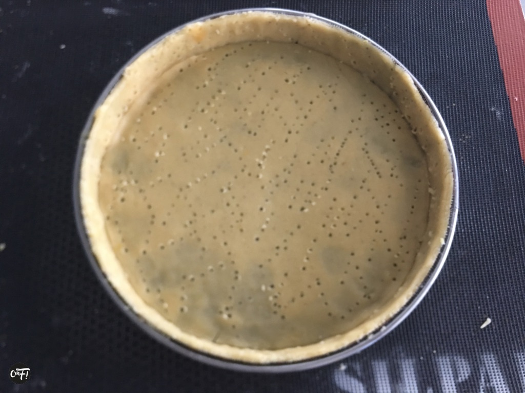 Quand la pâte est froide il faut l’abaisser. Je vous avais parlé ici de la toile de cuisson « Silpain » et du fait que l’on pouvait la découper et chemiser son cercle avec. C’est ce que j’ai fait ici. C’est simplement pour avoir un motif sur la pâte. Si vous avez un cercle perforé c’est inutile car il créé également des motifs comme vous pourrez le constater ici :