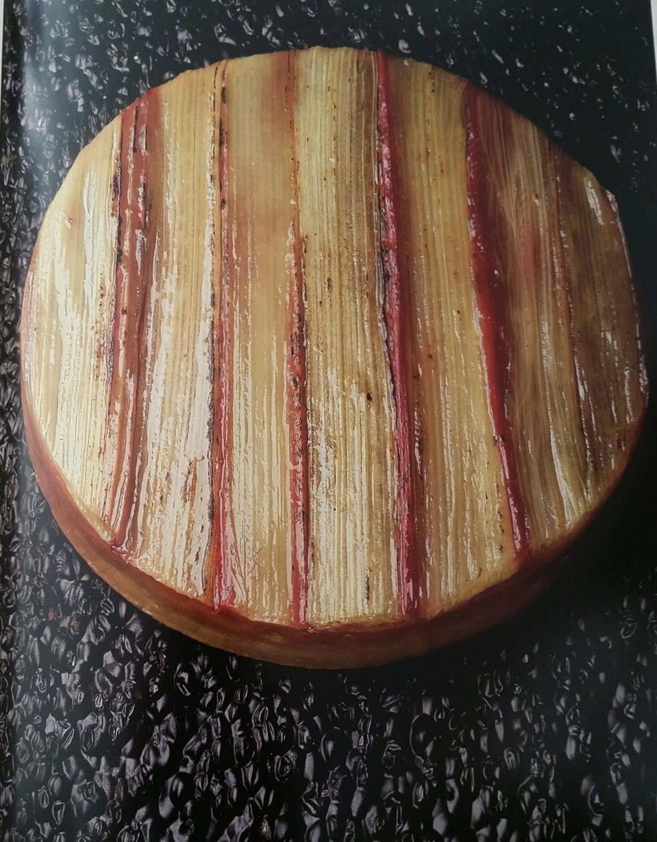 Voici la photo du livre pour que vous compreniez ce qu’il faut obtenir : des lamelles bien caramélisées. On voit bien que c’est le cas sur la tarte de Conticini. Voici ce qui est écrit dans le livre : « Hormis un bel aspect, les lamelles de rhubarbe apportent essentiellement un goût caramélisé de rhubarbe torréfiée, mais aussi une légère note craquante puisque les lamelles sont presque grillées ». Regardez bien sa photo, on voit qu’elles sont grillées aux bords :